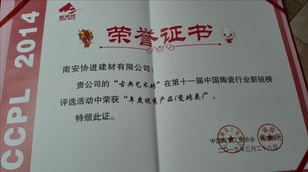 熱烈祝賀協(xié)進(jìn)陶瓷古典藝術(shù)磚在號稱“中國陶瓷行業(yè)奧斯卡”評選活動中榮獲年度優(yōu)秀產(chǎn)品獎。