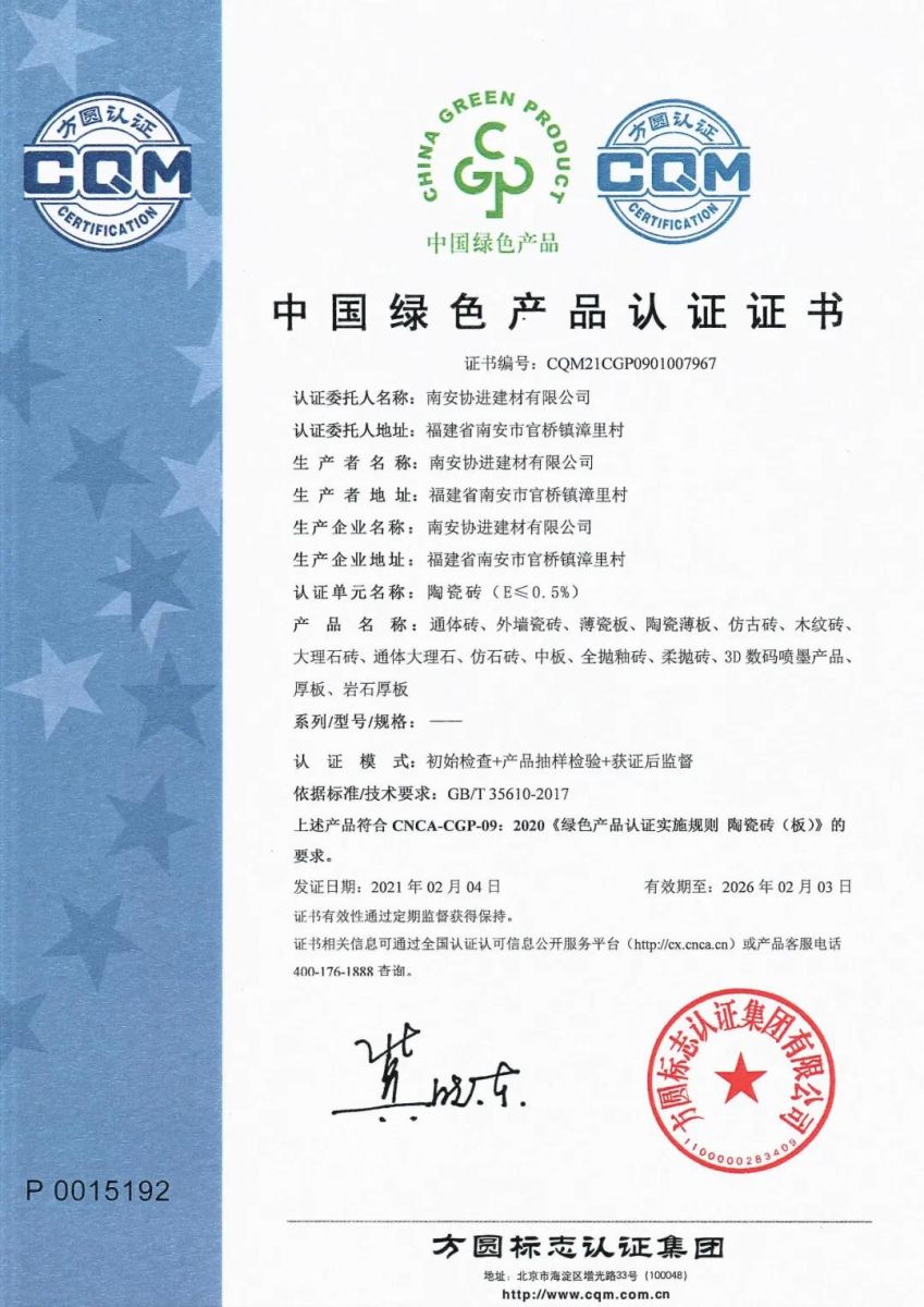 憑借持續(xù)踐行“綠色、節(jié)能、環(huán)保”的發(fā)展理念通過“中國綠色產(chǎn)品”認證。是對2012年獲評“全國節(jié)能先進集體”、2017年通過“三星級綠色建材評價標識”認證后的鼓勵和再次肯定。協(xié)進陶瓷將繼續(xù)與社會各界一同攜手構建低碳環(huán)保建筑體系,為實現(xiàn)企業(yè)與社會的可持續(xù)發(fā)展繼續(xù)努力。
